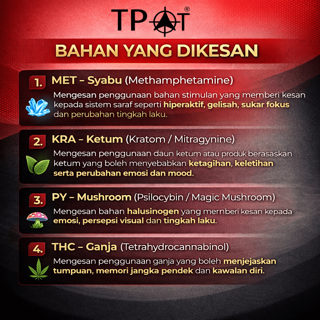 Mengesan penggunaan daun ketum atau produk berasaskan ketum yang boleh menyebabkan ketagihan dan perubahan mood.