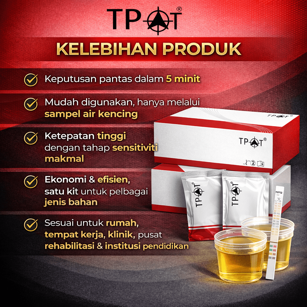 4-in-1 Drug Test Kit ini direka khas untuk mengesan empat jenis bahan terlarang yang paling kerap disalah guna di Malaysia — Syabu, Ketum, Mushroom, dan Ganja. Kit ini memberikan keputusan yang pantas, tepat dan mudah digunakan oleh individu, majikan, pusat rawatan atau mana-mana pihak yang ingin menjalankan saringan awal.