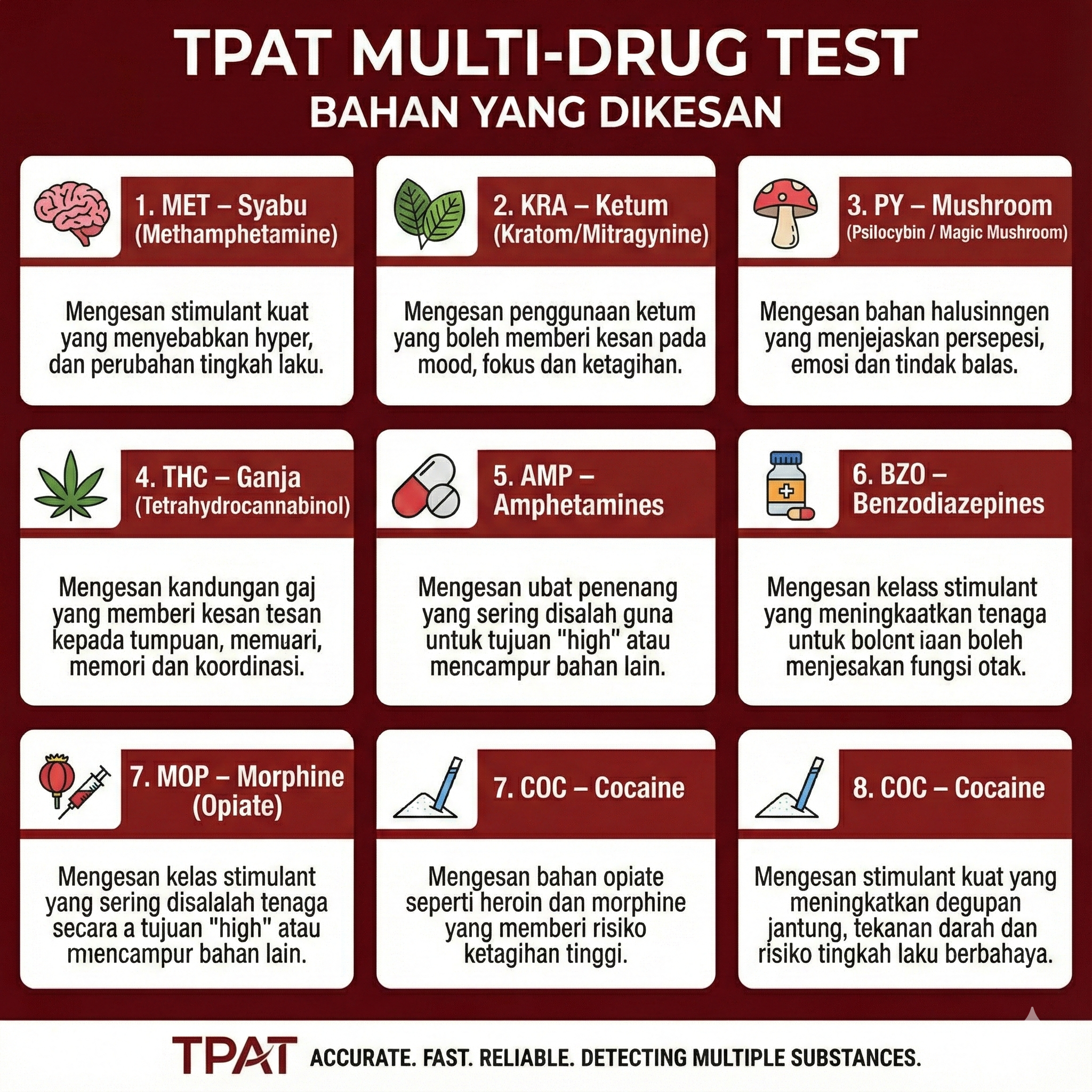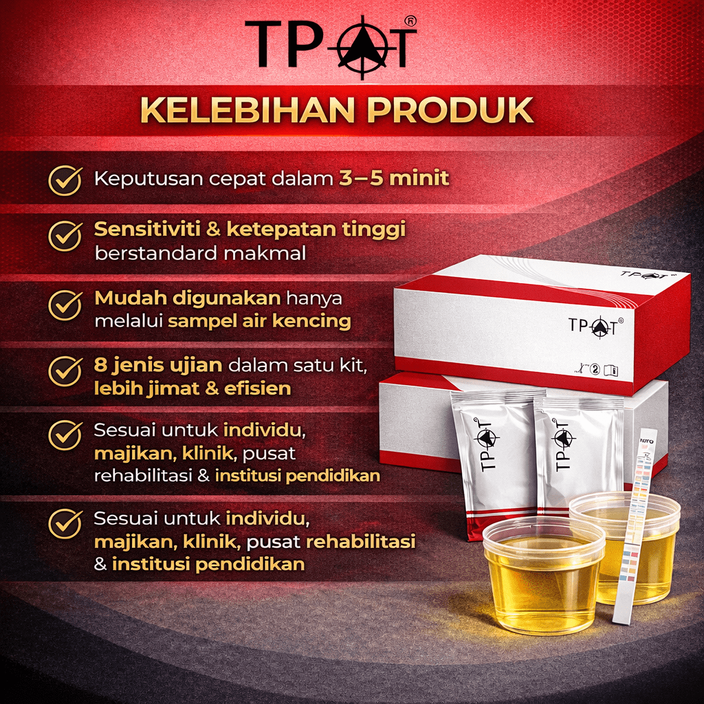 8-in-1 Drug Test Kit ini direka untuk mengesan lapan jenis bahan terlarang yang paling kerap ditemui dalam penyalahgunaan dadah. Kit ini memberikan keputusan yang cepat, tepat, dan sangat mudah digunakan untuk saringan awal di rumah, tempat kerja, pusat rawatan, sekolah atau mana-mana institusi.